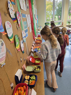 Zum Abschluss des Projekts bauten wir zusammen ein riesiges, tolles, buntes und gesundes Frühstücksbuffet auf. Jeder brachte etwas mit und so hatten wir eine große Vielfalt auf den Tellern. Wir hatten richtig Spaß und es hat sehr gut geschmeckt.