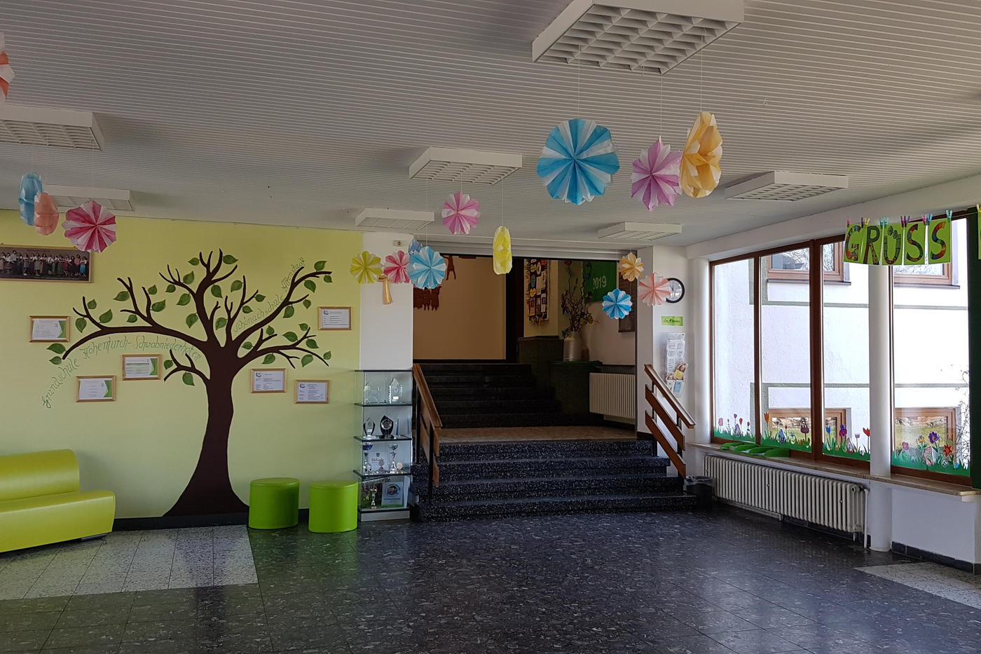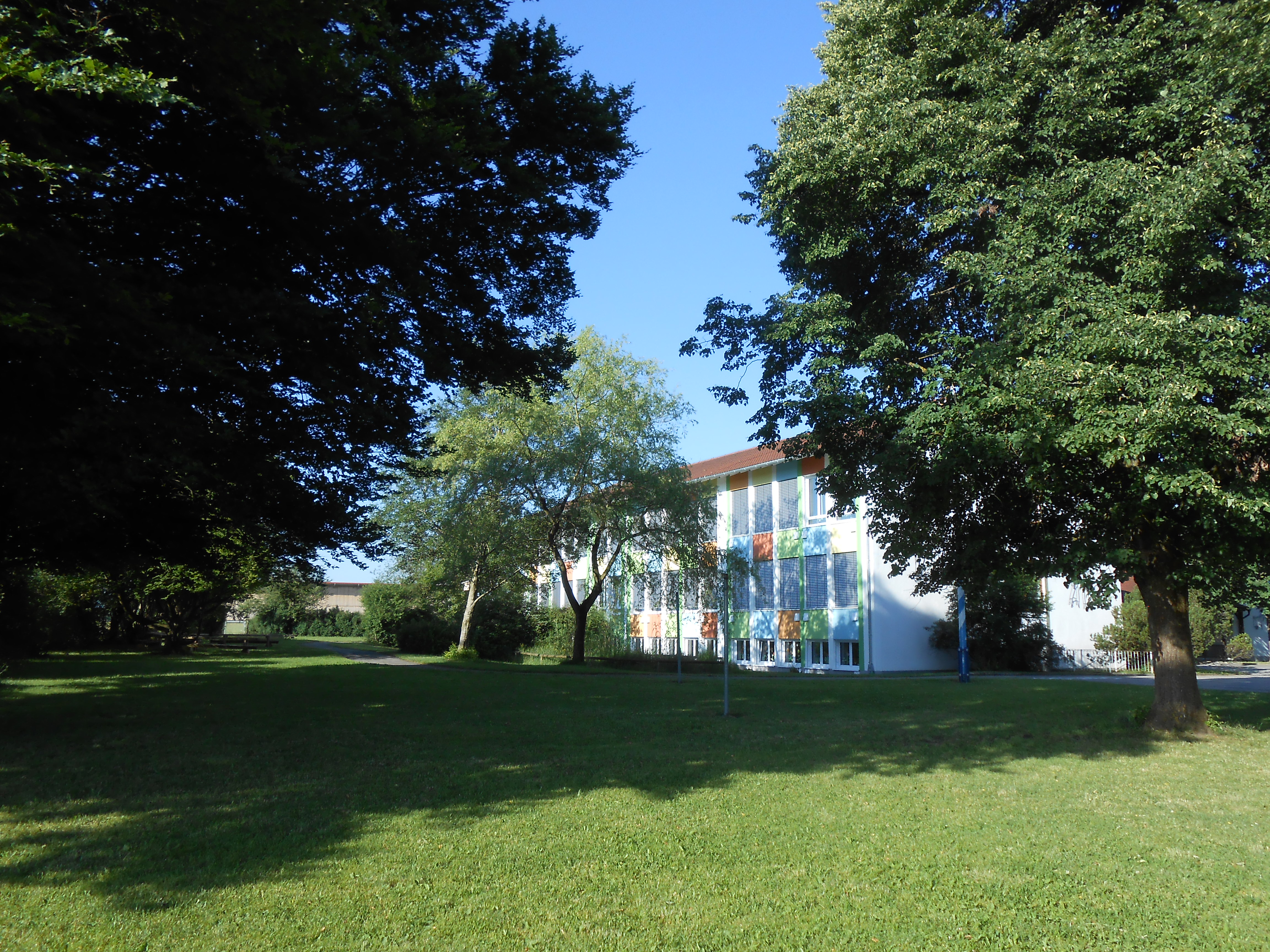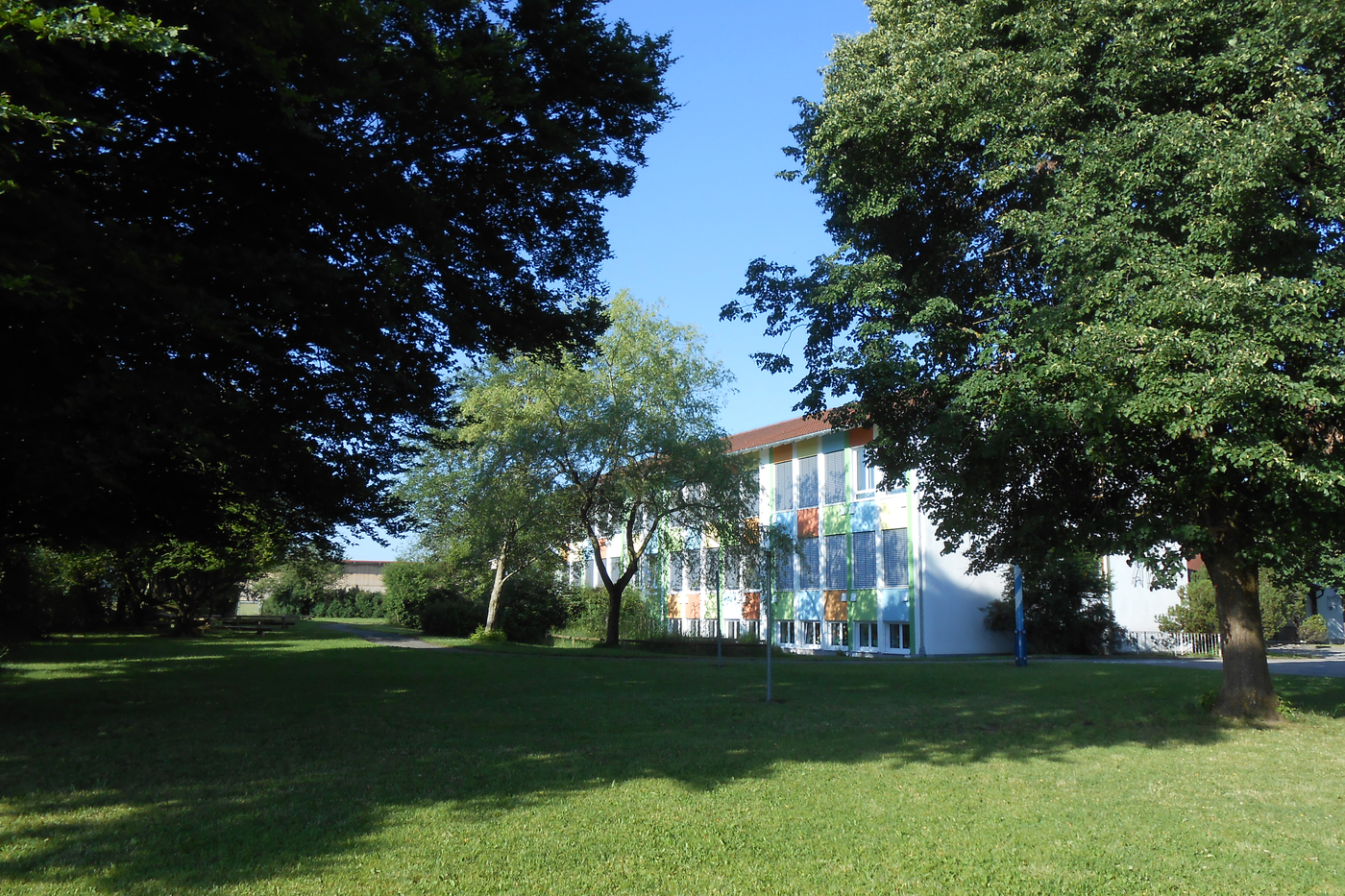 Unsere Grundschule befindet sich auf einem weitläufigen Gelände. Über die angrenzenden Wiesen ist ein freier Blick auf die Berge möglich.