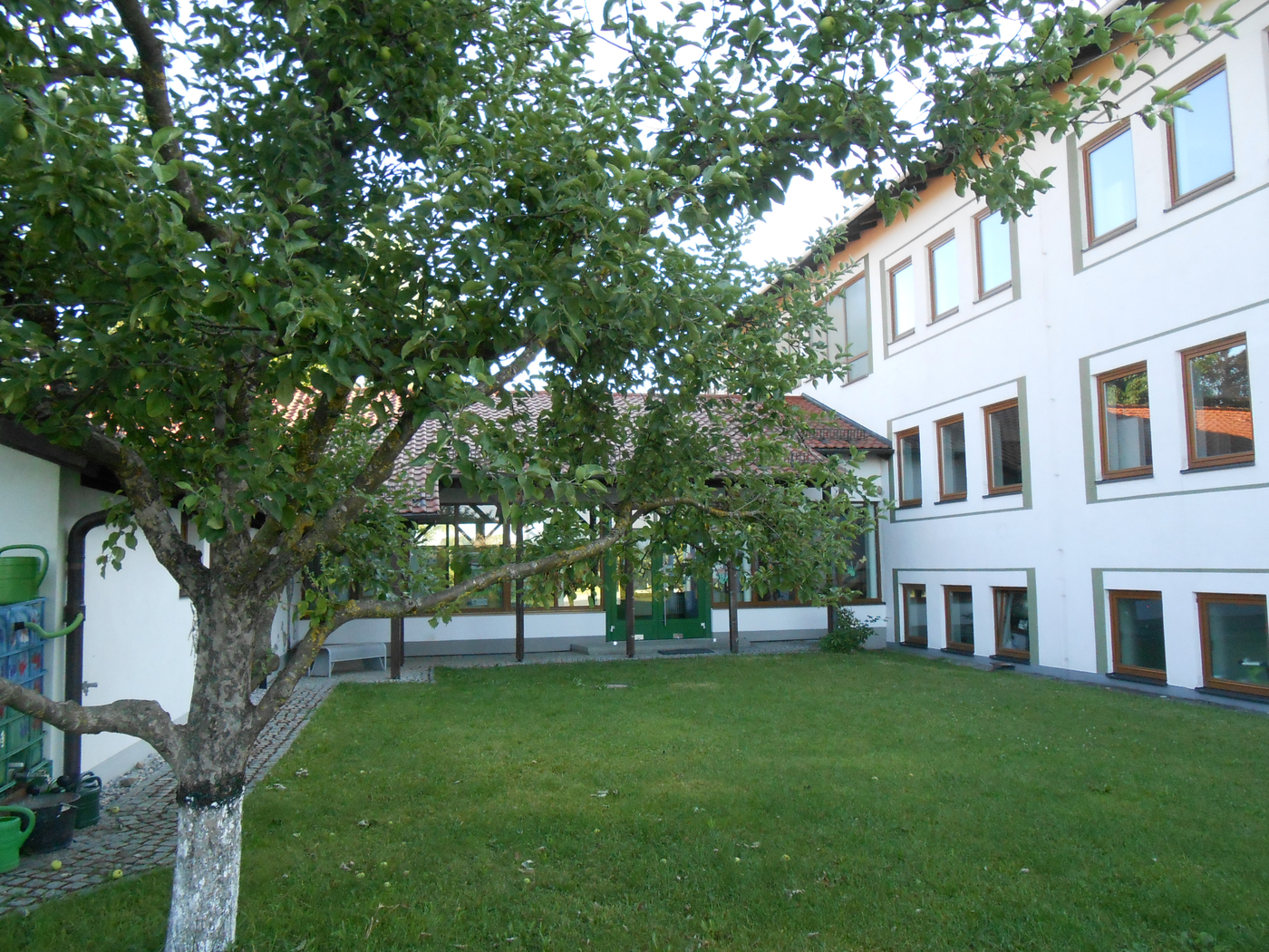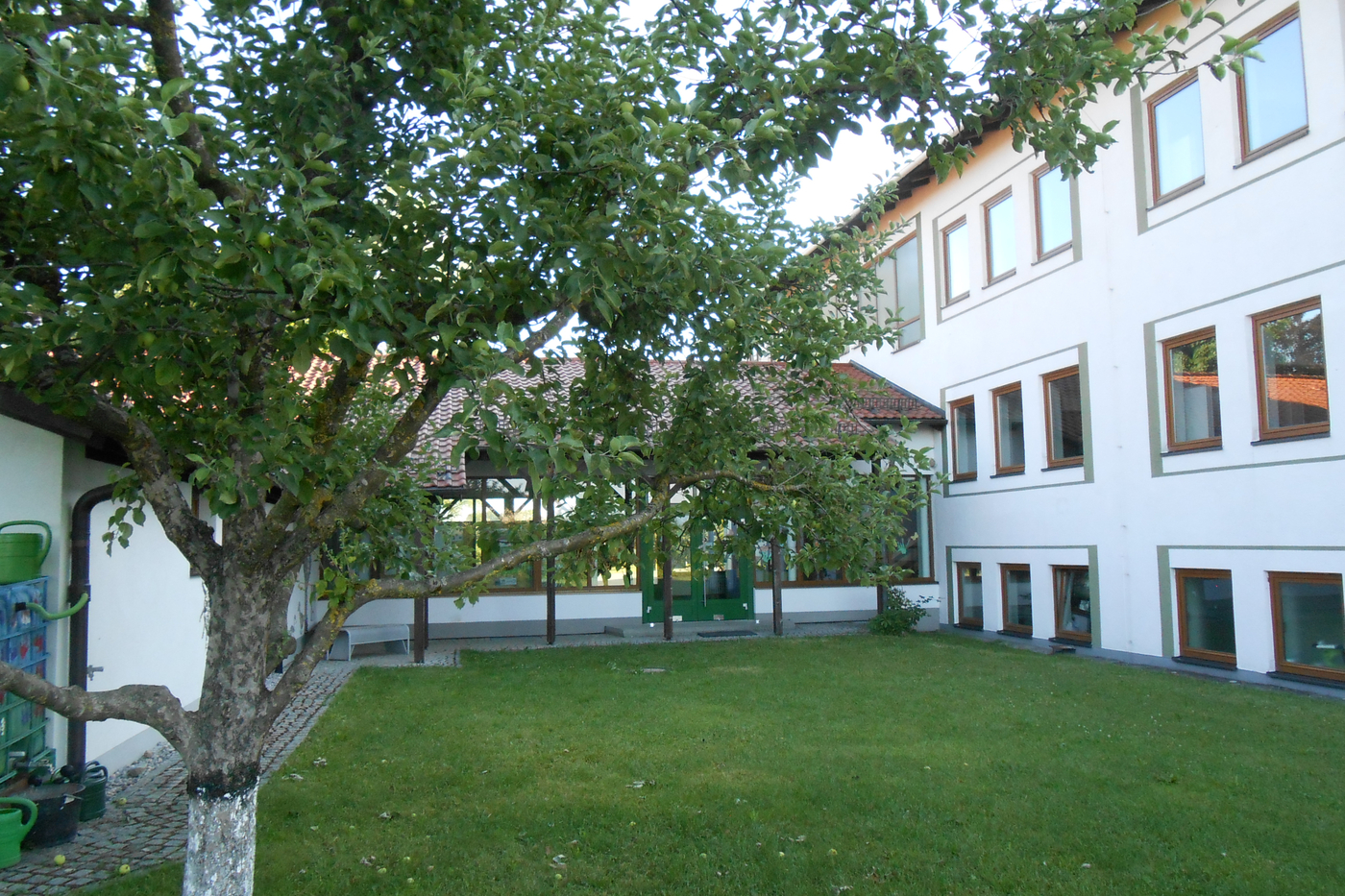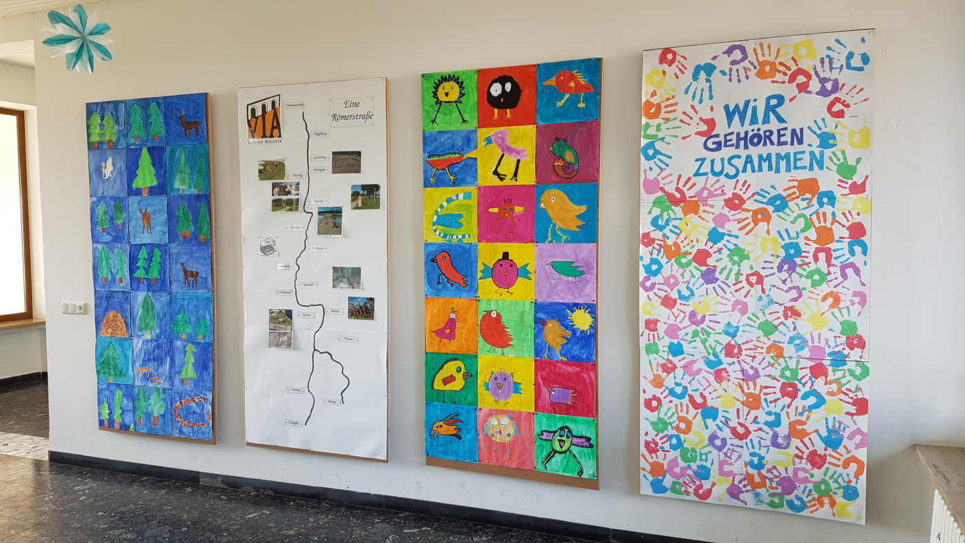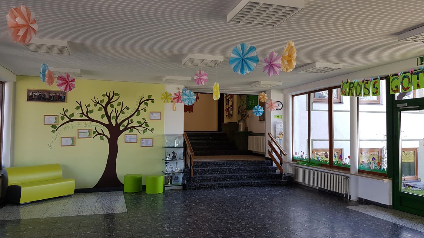 Unsere Grundschule befindet sich auf einem weitläufigen Gelände. Über die angrenzenden Wiesen ist ein freier Blick auf die Berge möglich.