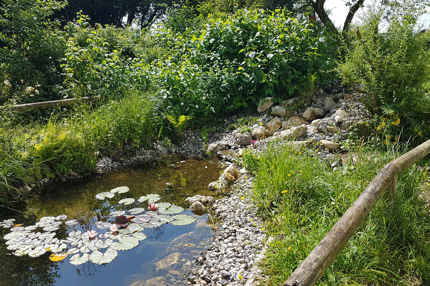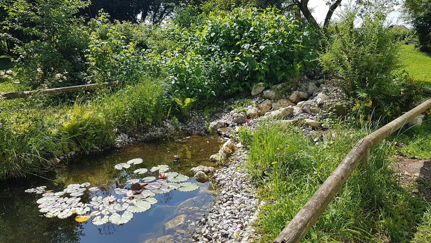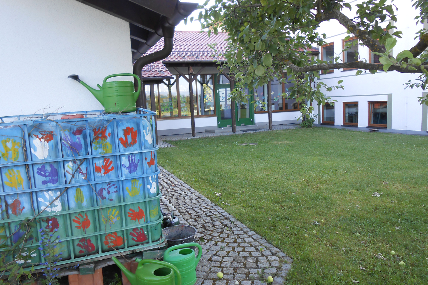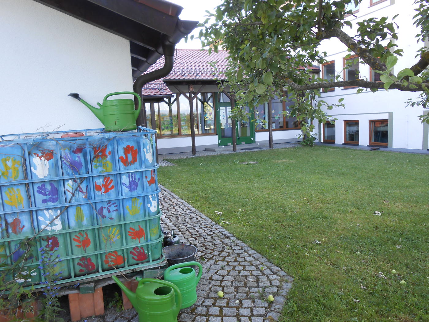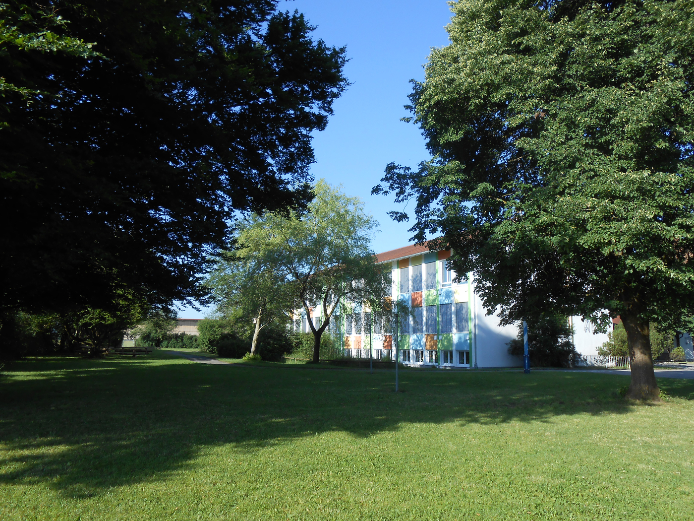 Das Schulhaus ist umgeben von einem großen Pausenhof mit alten Laubbäumen, Sträuchern aller Art und Grünflächen. Neben einem Schulteich mit Bachlauf und einem Schulgarten gibt es eine große Fußballwiese und ein Klassenzimmer im Grünen.